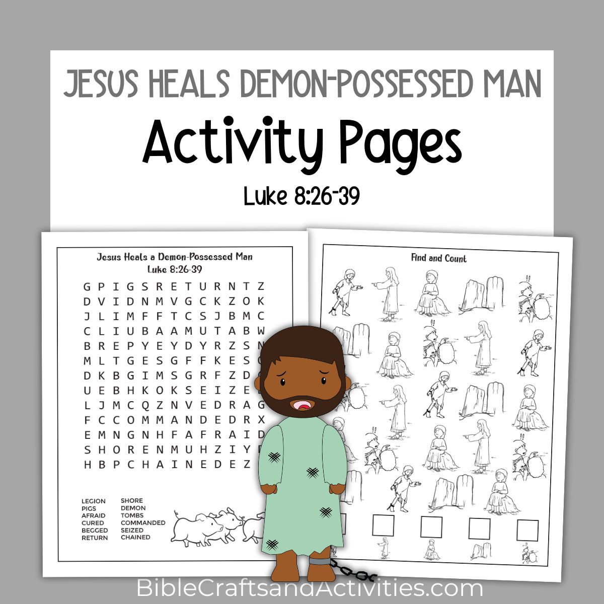 You’ll find easy and hard versions of the maze pages, which show Jesus making his way to the man with many demons.